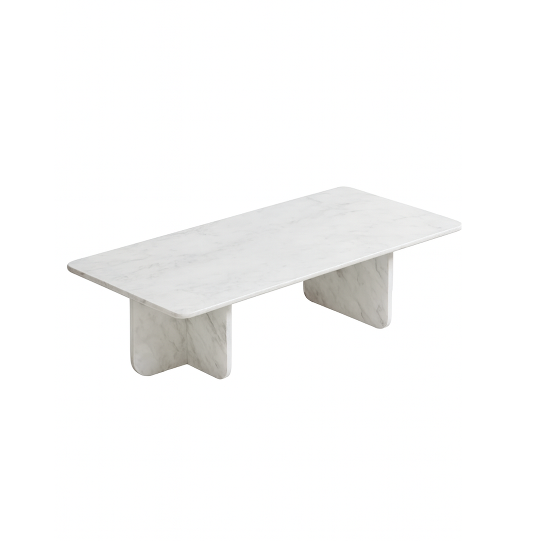 Alisa beyaz mermer orta sehpa, yalın hatları ve güçlü formuyla çağdaş yaşam alanlarına doğal bir zarafet katıyor. Geniş ve dikdörtgen tablası, büyük oturma gruplarıyla mükemmel uyum sağlarken, mermerin benzersiz dokusu her parçayı tek ve özel kılıyor.