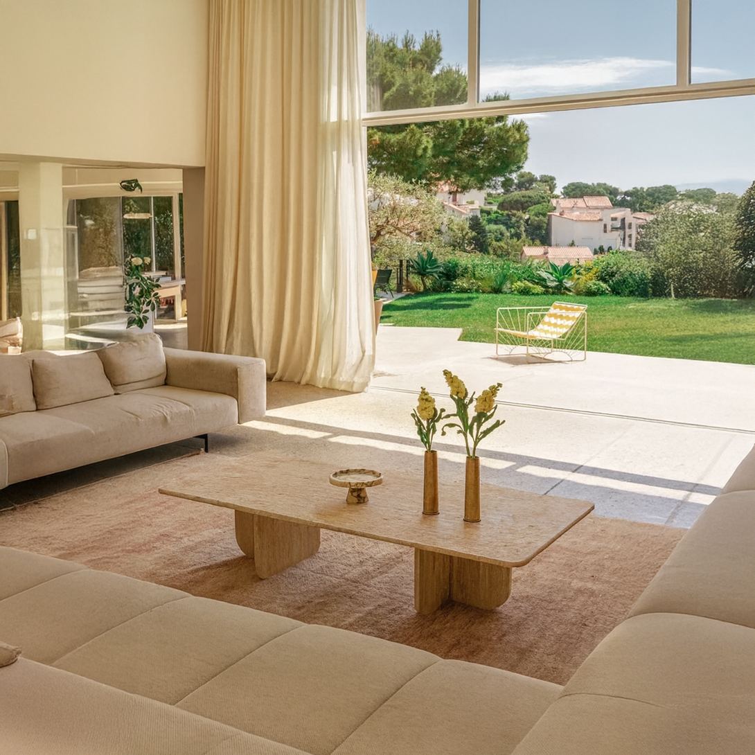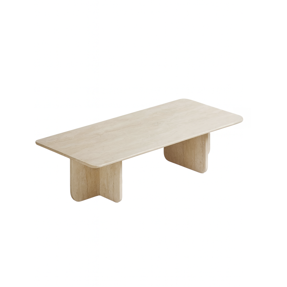 Alisa traverten orta sehpa, yalın hatları ve güçlü formuyla çağdaş yaşam alanlarına doğal bir zarafet katıyor. Geniş ve dikdörtgen tablası, büyük oturma gruplarıyla mükemmel uyum sağlarken, travertenin benzersiz dokusu her parçayı tek ve özel kılıyor.