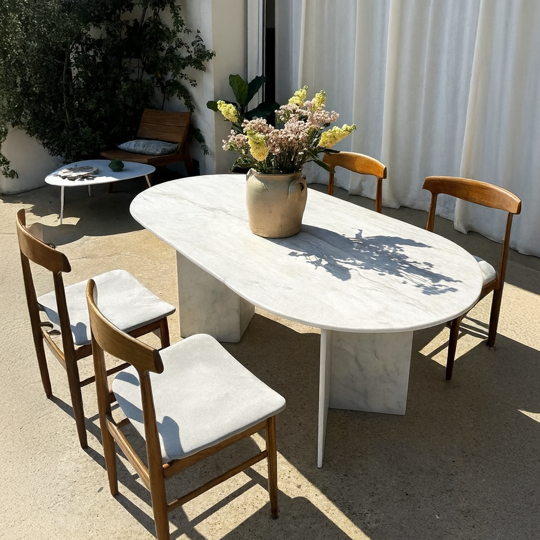 Zarif V şeklindeki ayaklara sahip beyaz mermer yemek masası, yemek alanınıza sofistike ve zamansız bir şıklık katmak için tasarlanmıştır. İnce gri damarlarıyla öne çıkan beyaz mermer, doğal taşın eşsiz güzelliğini ve sağlam yapısını yansıtır. Modern formu ile klasik zarafeti bir araya getiren bu tasarım, her ortamda göz alıcı bir odak noktası oluşturur.